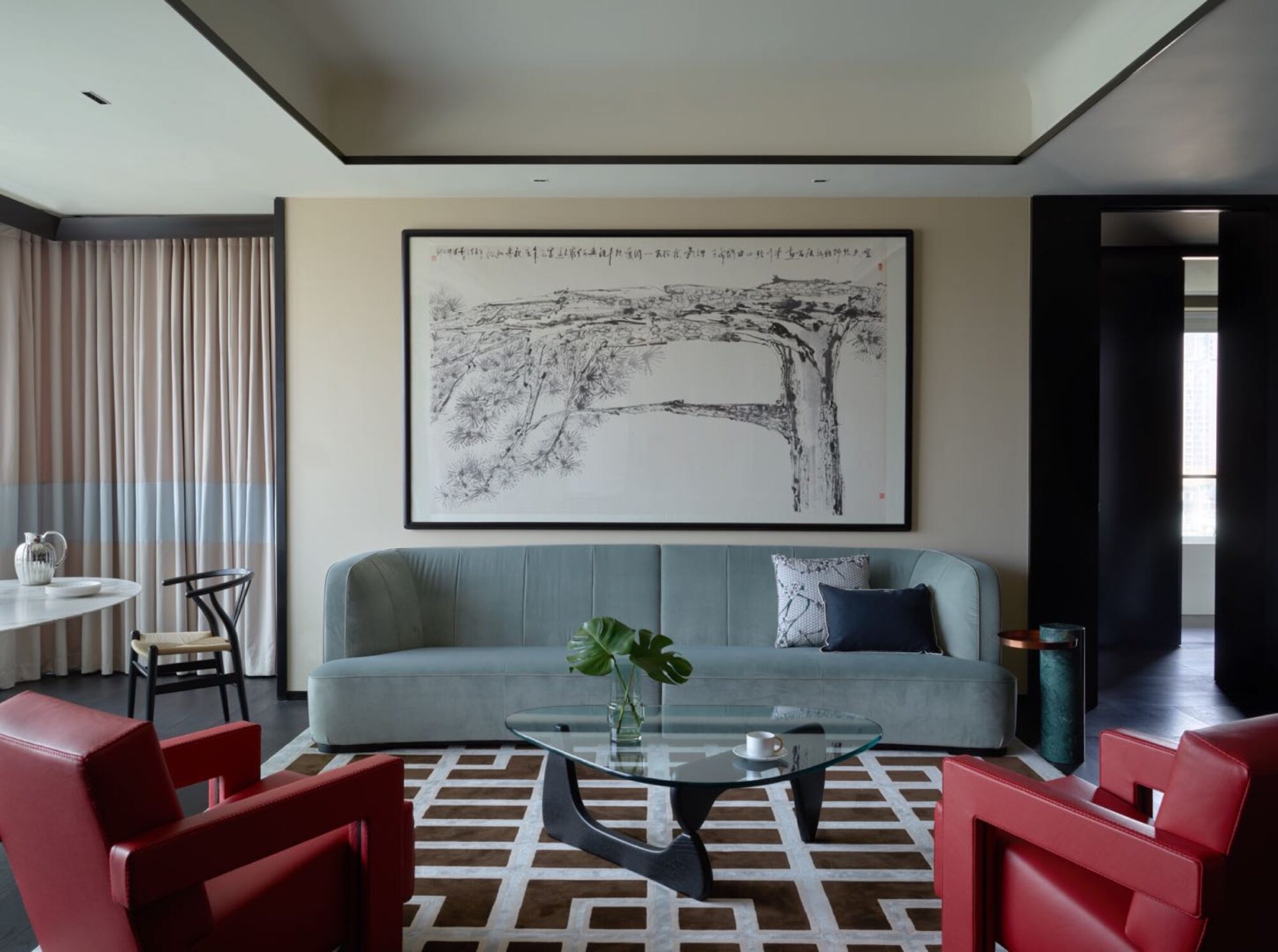 公寓的格局开敞疏朗。首先呈现的是风格强烈的客厅,Cassina 的红色Utrecht扶手椅奠定了空间的调性,经典、热情、饱含艺术感。它标志性的折角扶手与地毯上的图案交相呼应,太平地毯的Fret系列,灵感源于中国传统建筑中的装饰元素,交错回纹的样 式拉开了整个公寓东方韵味的序曲。